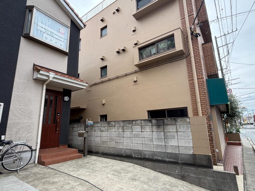 目印となるのは京成松戸線の踏切手前、風間ビルの緑の帆。その左の茶色の玄関の小さな一軒家が「prayers」です。