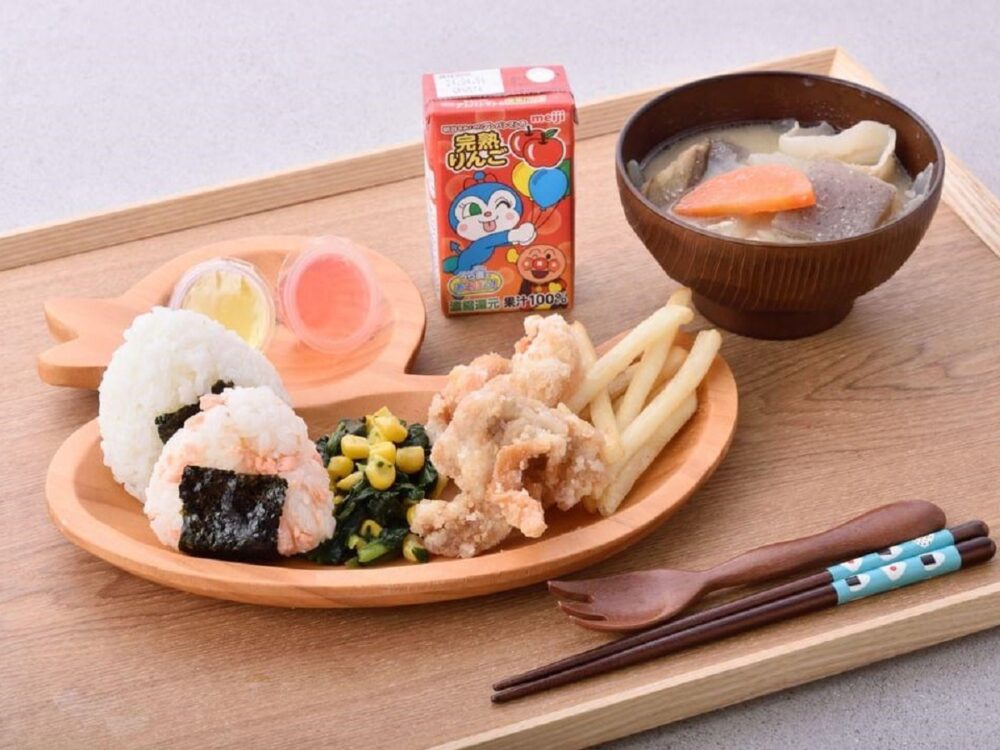 「キッズメニュー」(650円)はかわいい鳥の形の木製のプレートにのり、小さめのおにぎり2つ(塩と鮭)、ミニ豚汁、唐揚げ、フライドポテト、ほうれんそうとコーン、ジュース、ミニゼリー2種と充実の内容。